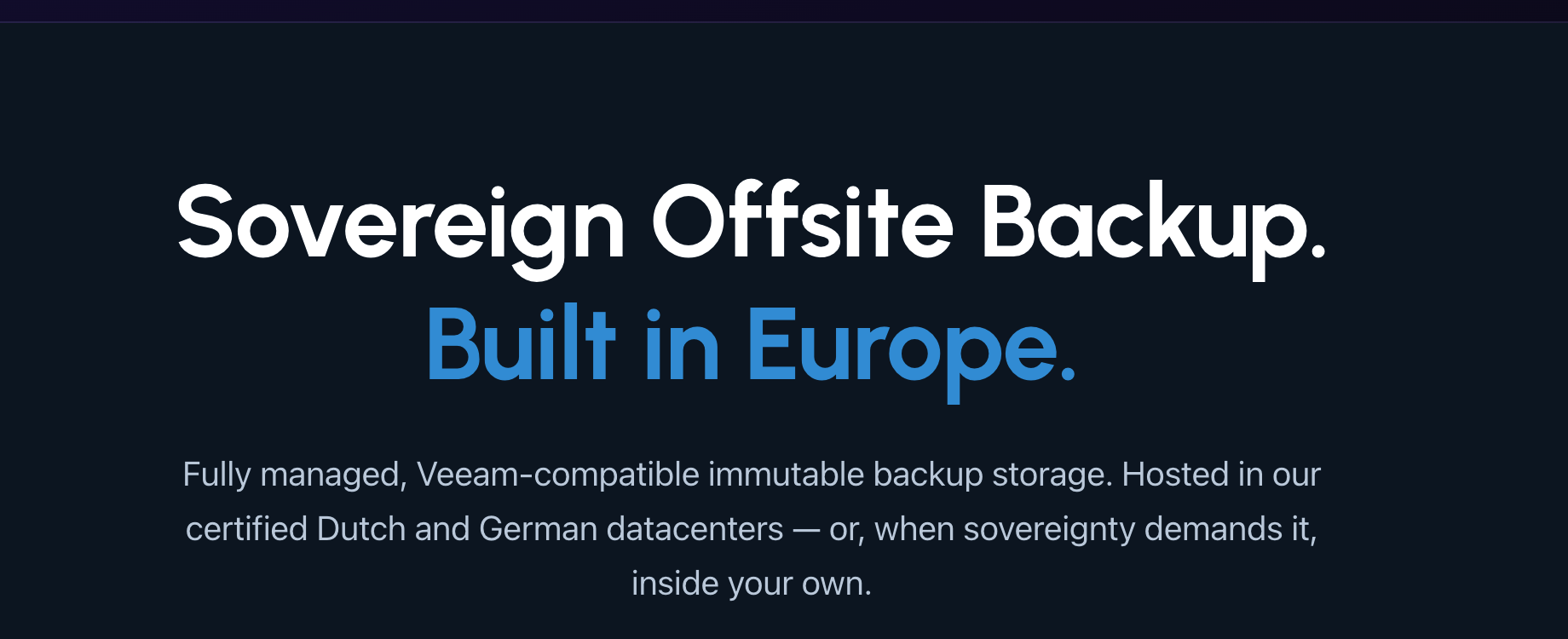 Fully managed, Veeam-compatible immutable backup storage. Hosted in our certified Dutch and German datacenters or, when sovereignty demands it, inside your own.